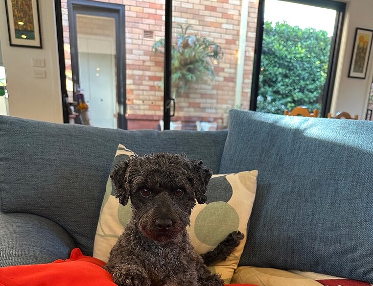 We have a very loveable and spoilt toy Moodle. As we are retired she is not often alone for too long. We have an oval across the road which she loves. The oval is enclosed and she enjoys a ball thrown, so she can retrieve it and bring it back. She has a spot at the front window and watches the day unfold, as people walk along the street. She enjoys going for walks through Telopea Park, which is 50 metres away from our home. We have a doggy door which she goes in and out of on her own.