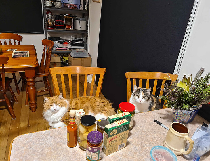 We have two indoor cats. They live inside, with access to the outside via an enclosed catio. We're after someone to feed the cats wet food twice a day, fill up water bowls and provide dry biscuits.