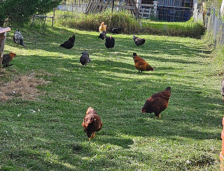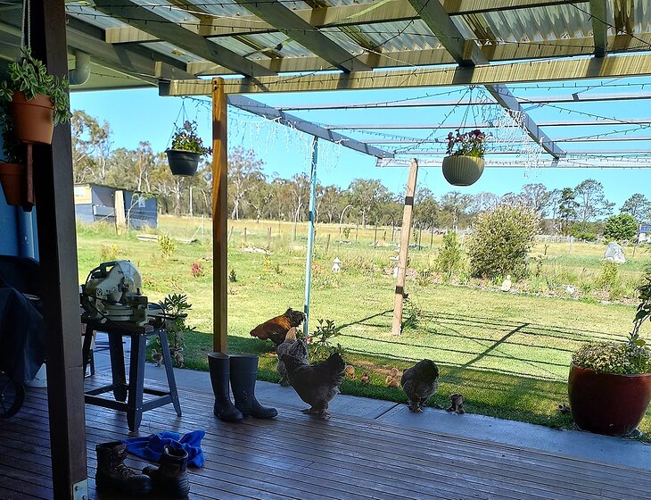 We have a few chickens that just need their door closed up at night and collect their eggs as they are all on self-feeders so no feeding required and 2 cats need a feed in the morning. the Cattle(5 of them) just graze on the paddocks, so nothing needed for them.