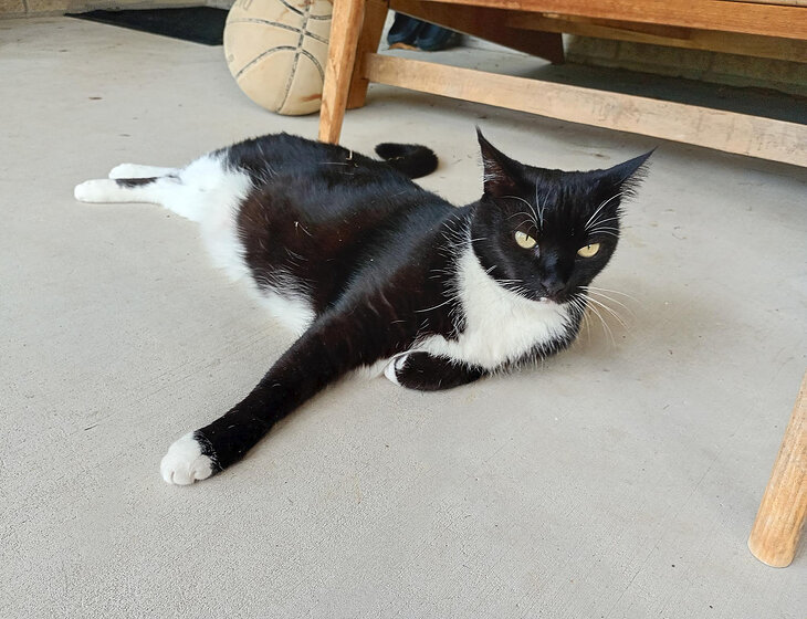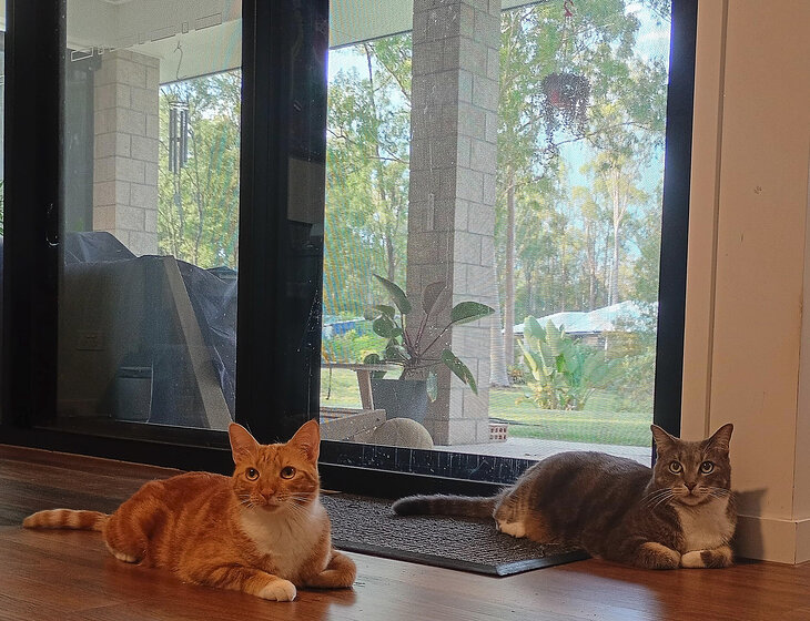 One of the cats likes to lounge outside for most of the day, but comes inside early evening.