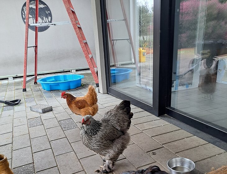 We have 4 chickens that need daily feeding/care and 15 goldfish in a pond that require feeding daily, and a top up of the pond in the summer months.