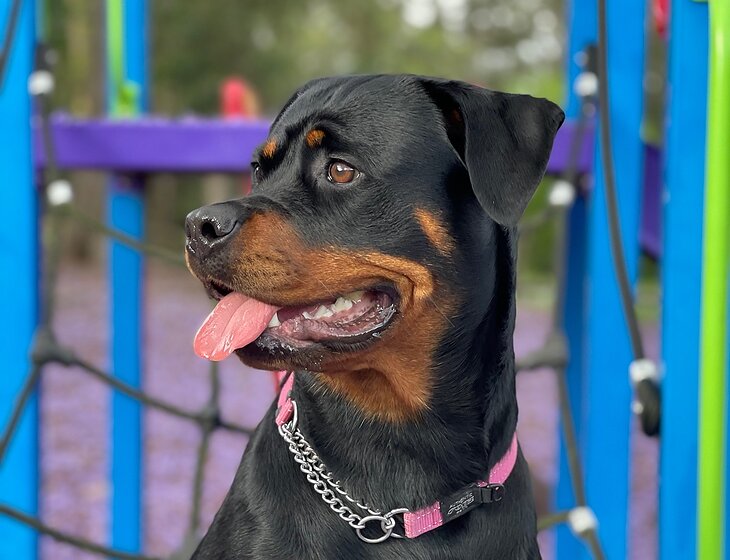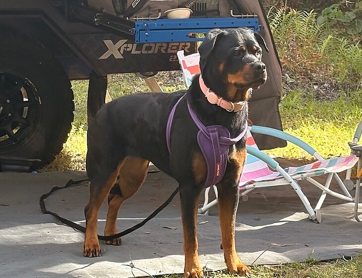 Sunny is a beautiful and very friendly Rottweiler with a heart of gold. She absolutely loves people, and after the initial excitement of meeting you she’s pretty calm and easy going. She’s 4 years old so still a little energetic if not walked, so will need walking once a day (or more if you’d like), but there is an easy walk from the property and you can throw a ball around the park for a bit, she’ll love that.