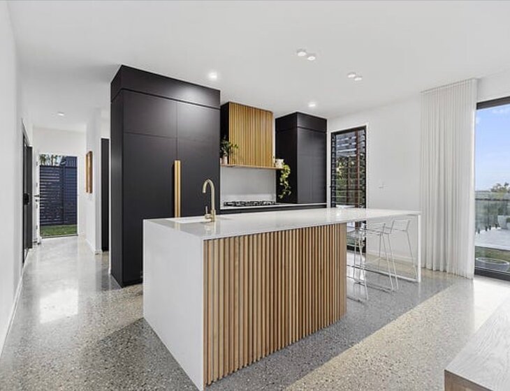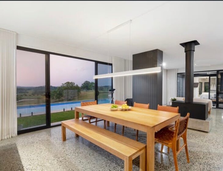 concrete floor, carpet in bedrooms, partially fenced, gas cooking, aircon, fireplace, carport, pool, media room, tiled bathrooms, dishwasher, built in fridge, 900mm oven, outdoor bbq, walk in pantry/laundry, views from kitchen-dining and living area