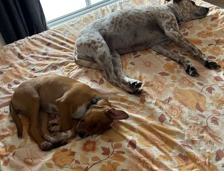 One dog is a puppy so will need to be walked/watched as he is still going through a bit of a chewing faze. Older dog is very laid back.