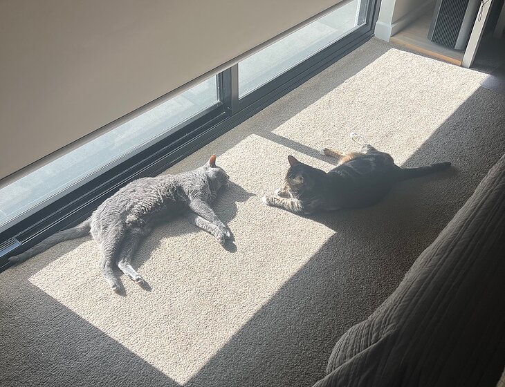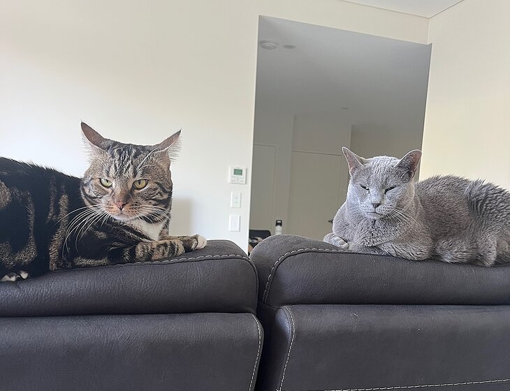 You will stay in the guest bedroom, full access to the kitchen, bathroom and there is also visitors parking which we can give you access to as it’s within the underground garage which is gated. The only thing we ask is for your consideration using the balcony as our babies will try and jump up on the ledge. No parties permitted. Our babies will want to be wherever you are. We have Inka (girl, 14yrs, grey Russian blue) and Dally (boy, 4yrs, dark brindle tabby). Inka is chill and loves to sleep all day. You may also find her sleeping on your pillow. She is super placid and likes it when you give her chin and neck scratches. Dally is cuddly but shy at first, he will take some warming up as he tends to get anxious around new people. Once he’s warmed up to you, his cheeky personality will come out. He will most likely sleep with you at night and curl up on your leg or feet.