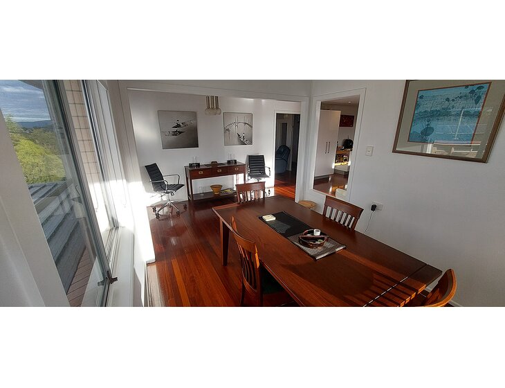 Upstairs, main bedroom is king, bathroom, separate toilet, office, kitchen, separate dining, and living areas, covered rear balcony with broad views from most rooms.