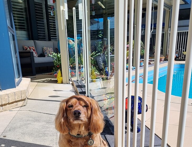Single storey 4 bed 2 bath, pool,garden and dog.