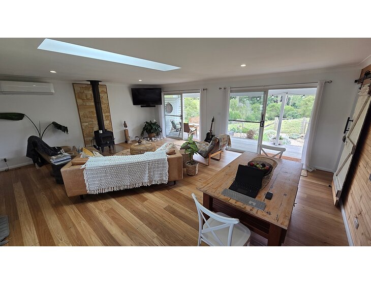Experience high-end rural bliss in our light-filled cottage. Designed with a Scandi-luxe aesthetic, the open-plan interior features a wood-burning fire, stone feature walls, and a sky-lit ceiling.