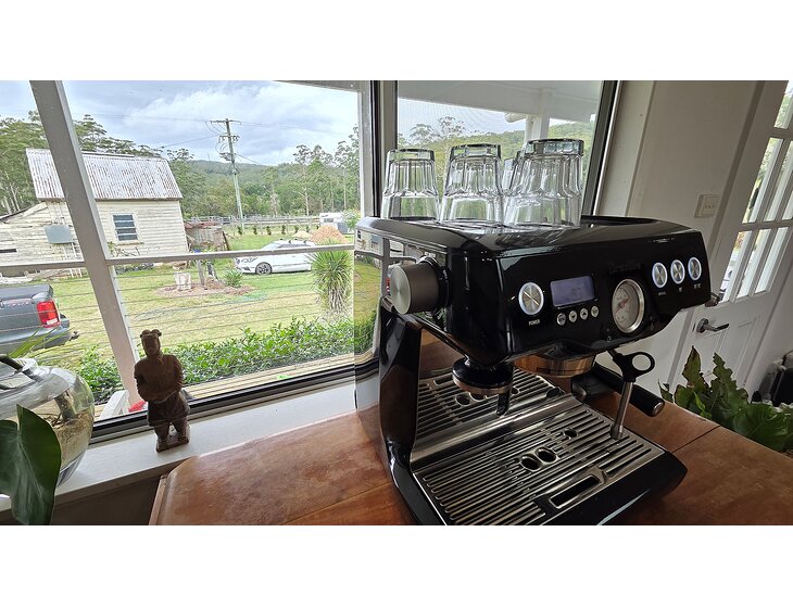 Barista Mornings: Premium Breville espresso station with sweeping paddock views.