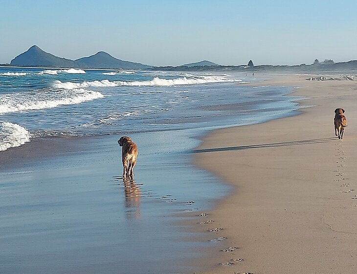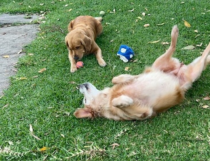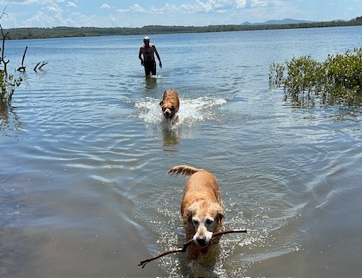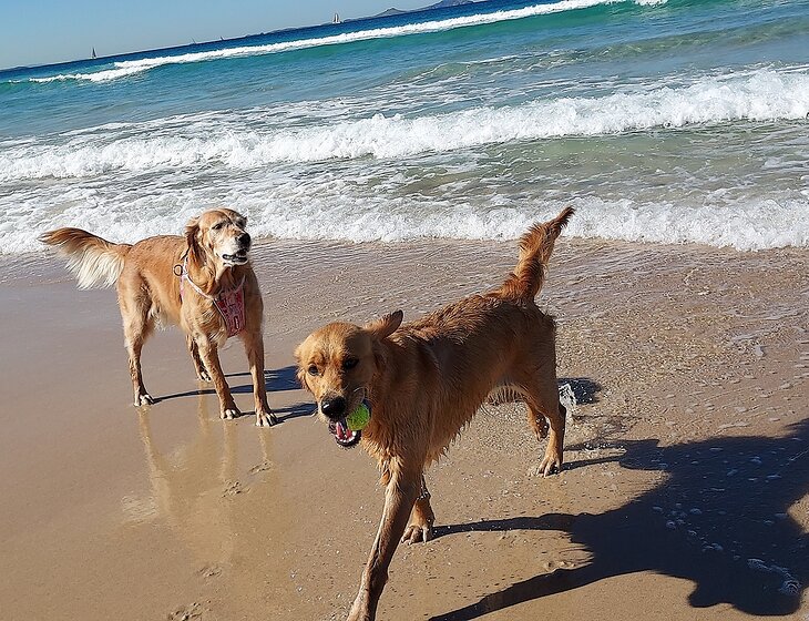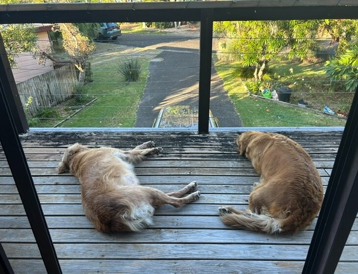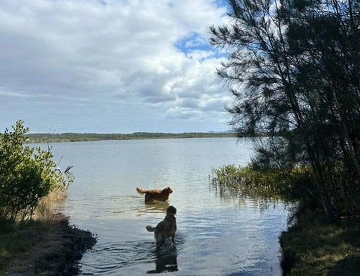 Peach is our 10 yr old golden retriever and Daisy is her 4 yr old daughter. Peach is easy going & very loving, after a leisurely morning wander she spends most of the day dozing or hoping for belly rubs but is also happy to lay in the shallows at the beach or river across the road.