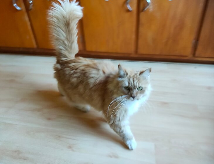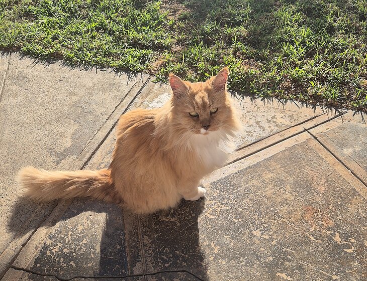 She is a longhaired ginger female cat who likes to be brushed and patted. Mainly lives outside but likes to come in of an evening. She is 18 yrs old and in good health.
