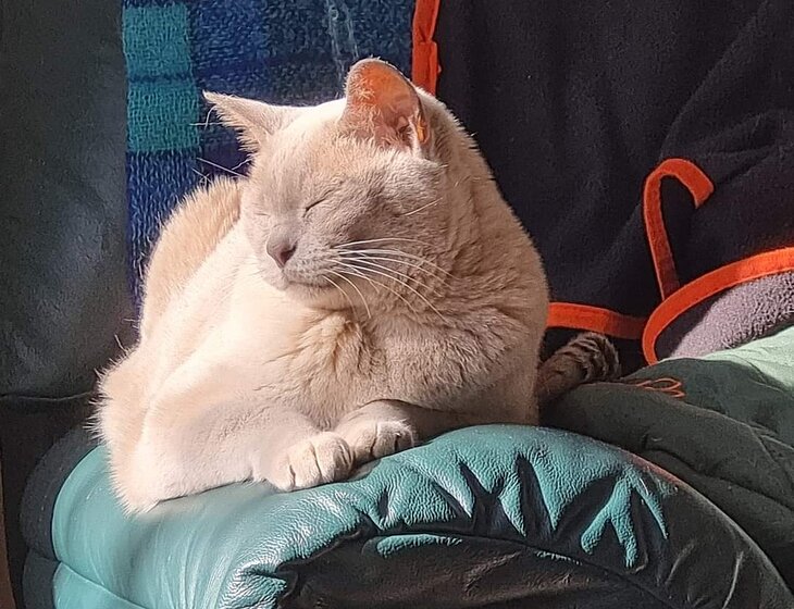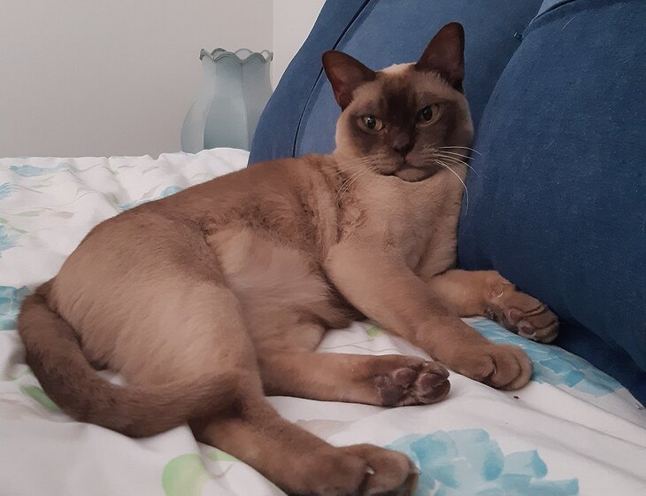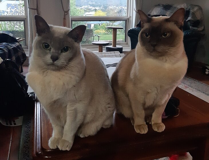 We have two Burmese cats - Lily (17) and George (12). Lily is lilac (sitting on the arm of the green chair). George is chocolate (lounging on the bed). They are Indoor cats with access to our enclosed backyard. Lily has chronic kidney disease, managed by a veterinary prescribed diet , high blood pressure and arthritis but is otherwise in good health. She needs to be given a tablet daily, which is generally easy to do. She can be fussy about eating so is a bit more high maintenance than most cats. George has no health issues. They don't like other animals, so we can't have guest pets.
