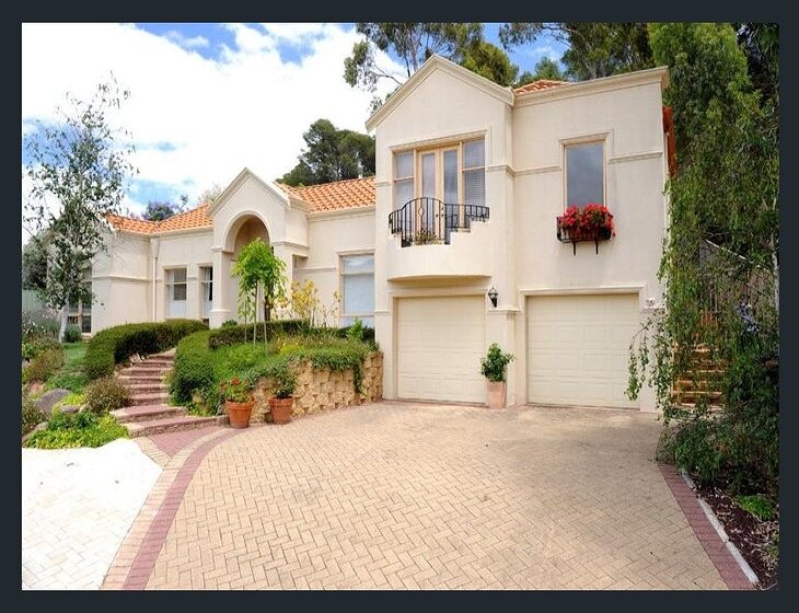 Our home is on a hammerhead block with a 50 metre driveway on a hillside. There is bush at the back and the River Torrens Linear Park at the end of the street. It is a three bedroom, open plan living house. Our garden is tiered and easy care with an automated watering system. There is a two car garage but our cars will be stored in it. There is uncovered parking for 2 cars.