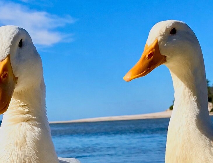 Out the back, we have two Pekin ducks who are used to the dogs. They’re low maintenance, just needing a quick crate clean and fresh water each day. They can be shy at first but warm up over time and are a fun little addition to the home.