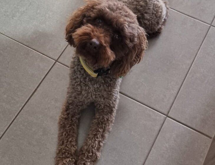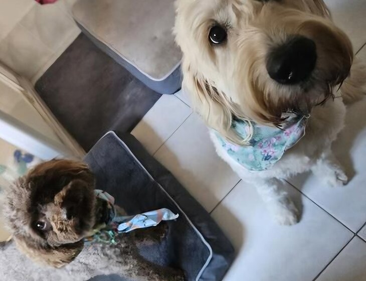 We have two 9 year old dogs, one being a standard Groodle and the other a miniature groodle. Both dogs are loving and love cuddles and are well behaved. Blu and Groot are there names!