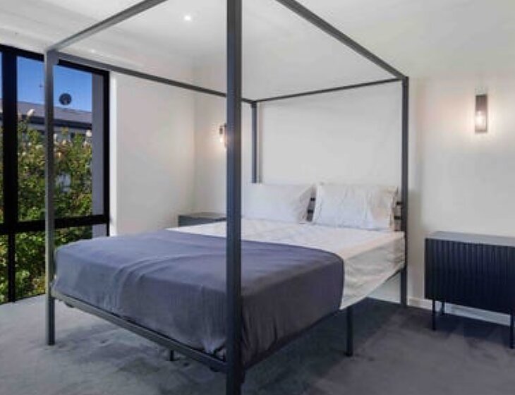 It is a modern townhouse in a quiet street.