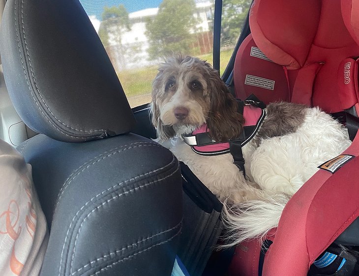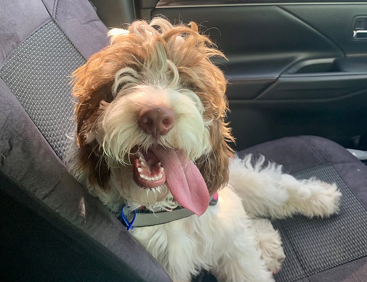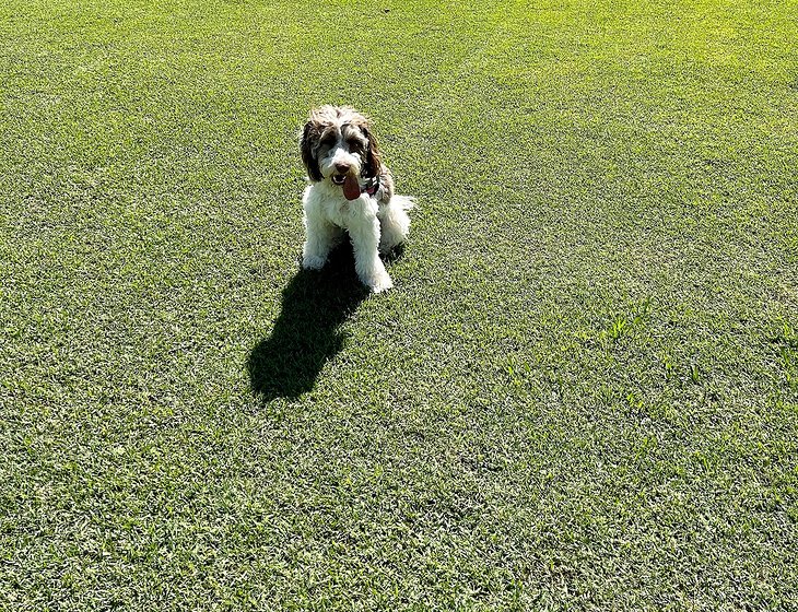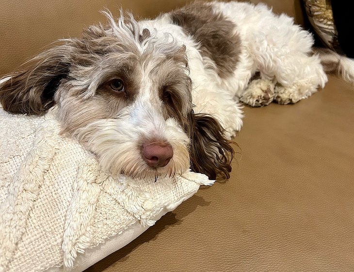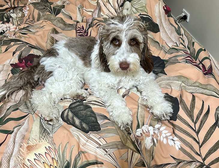 Sadie is non shedding and lives in the house with a doggy door for outside access.