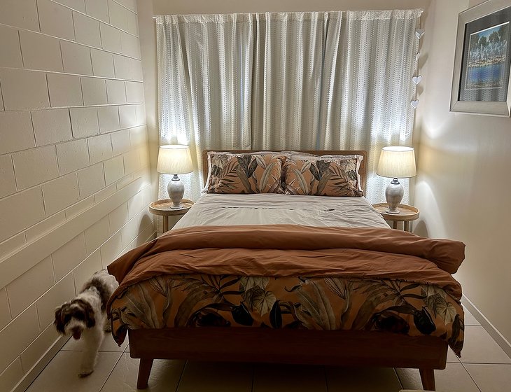 Queen bed and ceiling fan & air con in lovely guest room. Ceiling fans and air con in living areas.