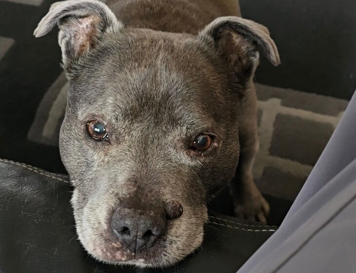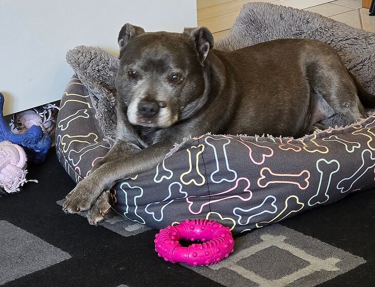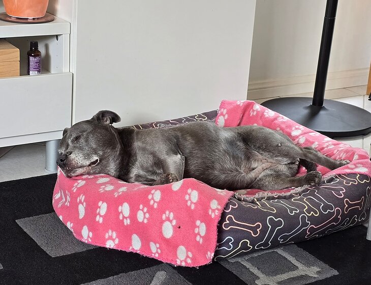 The dog: 14 yo (in April) female Staffy who needs company! She's happy with just having someone around but sleeps when you go out. She is used to sleeping in the bedroom in her bed and does snore at times! She has a doggy door and takes herself out to the loo early hours of the morning. Always uses the door in the day too. Very little walking required due to her age. She's a bit of a licker unfortunately, pretty deaf and has cataracts.