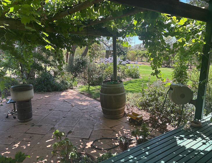 3 bedroom house 2 bathrooms with on half an acre with garden and surrounded by vineyards. No stairs and a large deck with heating and a television and an automatic printer system