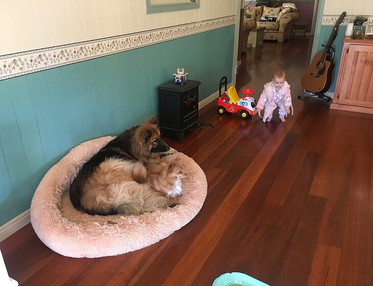 We live on 2 acres with landscape gardens and a pool. We have a 7yr old German Shepherd (Bear), a 6/half yr old Cat (Milo), as well as my daughters small chihuahua Bailey 3 yr old. All are indoor pets and can go outside whenever. We live in a lovely town and the property a Queenslander is very private, peaceful and tranquil with electric security gates.