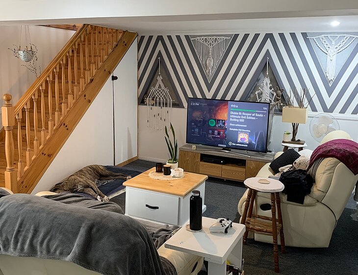 Our home is located in a quiet, peaceful area near a reserve and park, where we take Sophie for her morning walks every day. The house has three bedrooms, one bathroom, and a kitchen upstairs, while downstairs is set up as a fun space for entertaining, games, and exercise. There’s also a large pool in the backyard to enjoy.