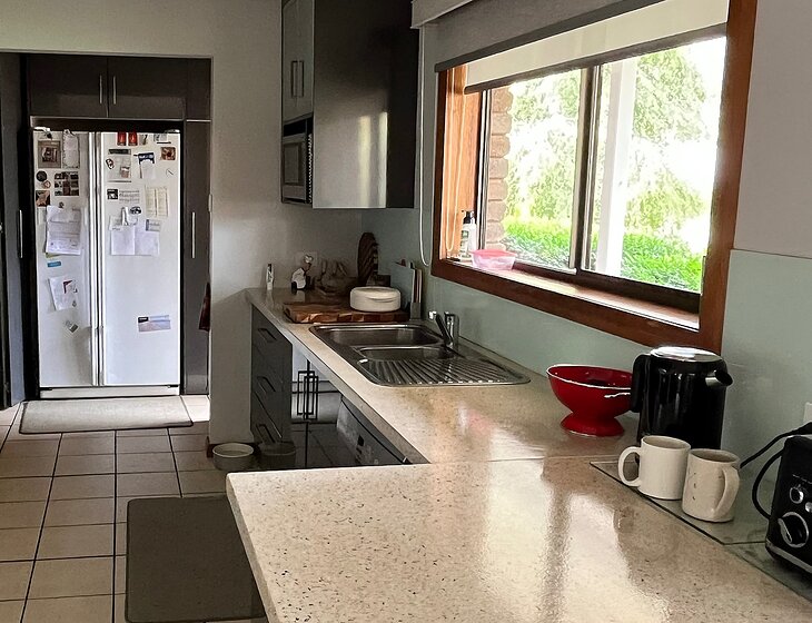 Our house is situated on 5 acres in the country and is a modern 4 bedroom brick home with an extensive enclosed outdoor area with BBQ facilities. Internet is available. Our home is best suited to couples as we prefer our guests to use either of the two spare rooms which are both furnished with a queen bed. Alternatively you are welcome to have use of the house if you prefer to sleep in your own caravan as past sitters have done .
