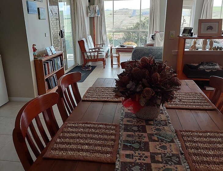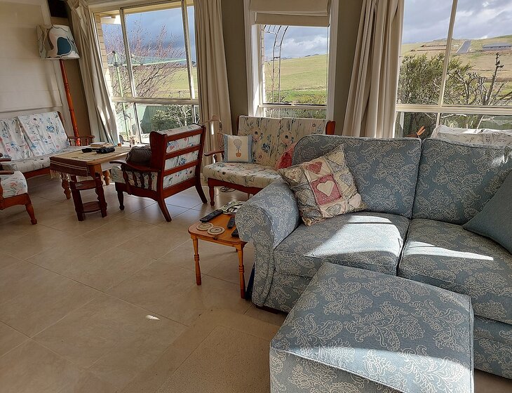 We have a comfortable 3 bedroom home, with a large living area, study, bathroom and ensuite. The living area is very open, and on the northern side of the house, so gets beautiful light, along with views across farmland, where kangaroos often graze.