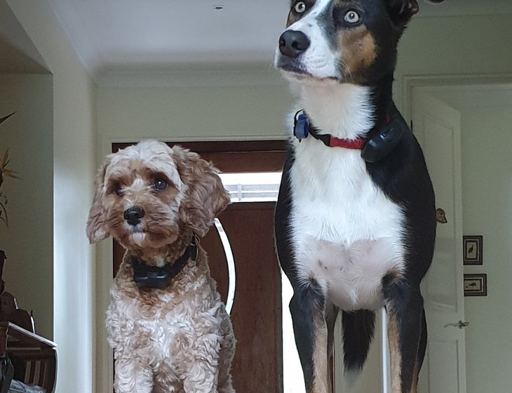 Jinny is a cross kelpie/border collie and Kaylee is a Cavoodle. Both will be 6 years old next September. We have a hidden fence system, so they are safely contained on our 2 acres. Oh, and they love lots of cuddles too!