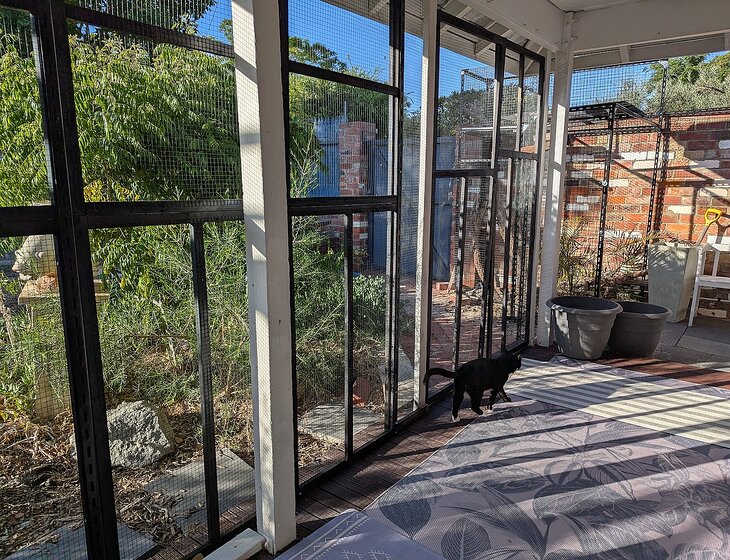 Henry (fluffy white and tabby) was an outdoor explorer but he is now getting used to his enclosed patio and cat run.