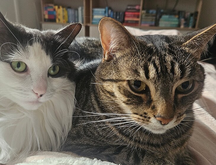 2 indoor cats, Augie and Daisy. Augie loves human company and lots of pats, Daisy prefers 5o do her won thing but will show you love when it's dinner time.