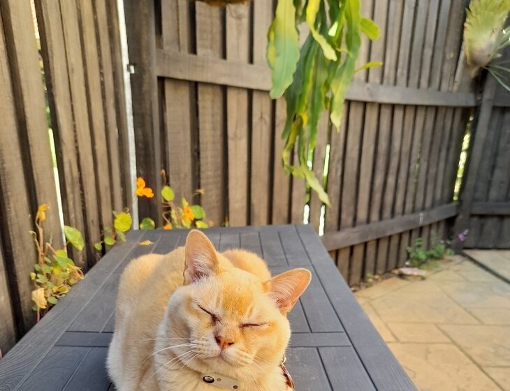 We have a 15year old red Burmese Cat ! He is very loveable and loves attention and company but is also easy care. He is outside during the day if he wants to be; but locked inside at night