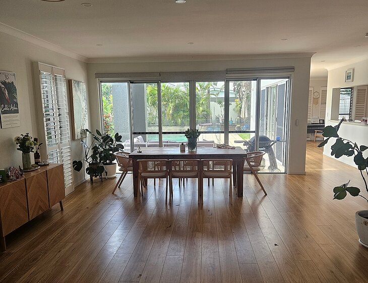 Large house with pool, air-con etc on the beach (salt) in kingscliff. Easy walk to creek and town and salt resturants/ cafes. We have an elderly ( 17 years!) Schnoodle which just need feeding only as they mostly lie around the house. Also 3 very friendly hens who lay daily