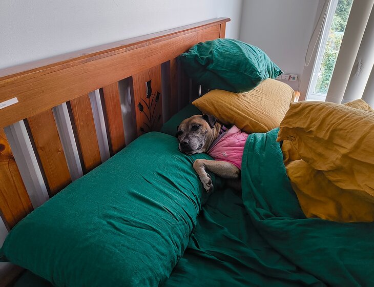 Our dog is an 11-year old brown staffy, VERY sweet and affectionate with humans, however she is not great with other dogs so unsuitable for boarding. Treat the home like your own while you're here!