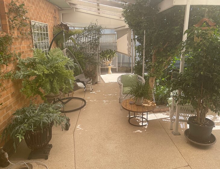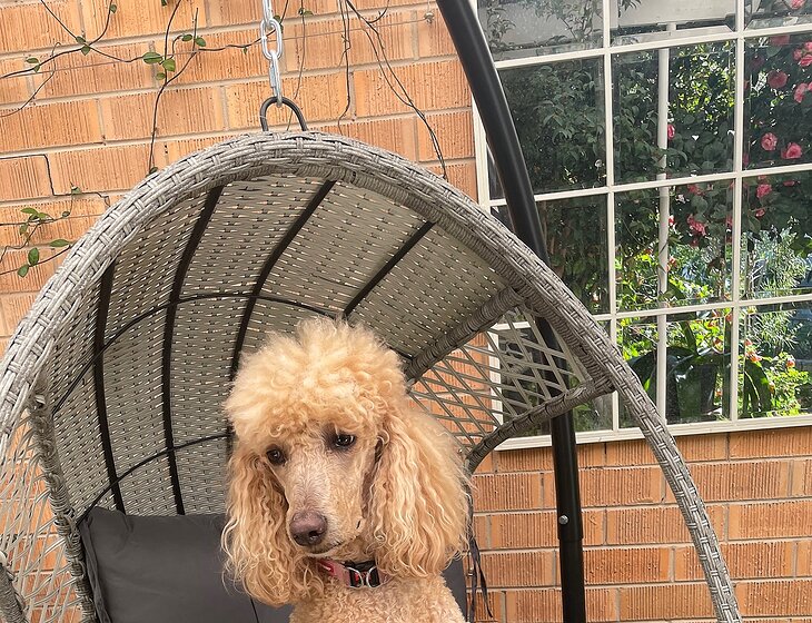 I have a 3 bedroom home. There is a big family room at back that looks out onto a beautiful garden. I have 2 standard poodles one black McKenzie 11 years young and an apricot one Penny she is 5 years old a gentle girl. There is also a wild bird that comes everyday to be fed, the there are 7 chickens