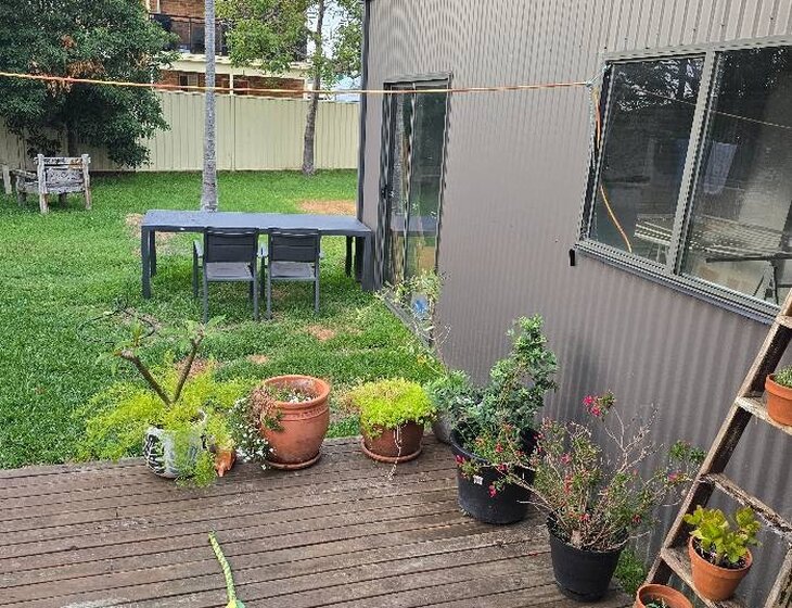 The yard is tidy and great for sitting outside with a drink, enjoying the summer sunshine. Garden care is minimal — just giving a few pot plants and veggies a drink every couple of days.