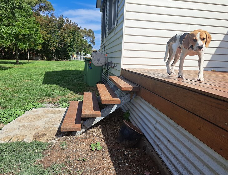We have a two-year-old beagle Dougal that needs to be fed twice a day, and he loves a treat or two, he spends his days outside and sleeps on his bed on the house.