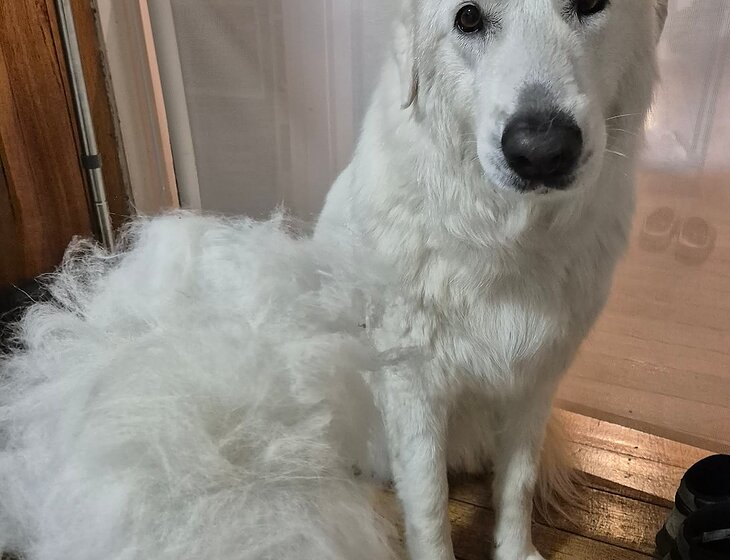 We have an 8 year old Maremma sheepdog, Honey. She doesn't gel with most dogs but LOVES people. Her favourite thing is pats/holding your hand. She's happy outside during the day but needs bringing inside at dusk.