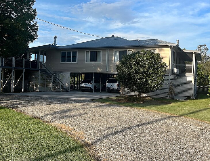 We are a full time working couple with children and grandchildren in Brisbane. We live in a high set flood free home on the banks of the Clarence River with 2 hectares of lawns for you to enjoy (no mowing required).
