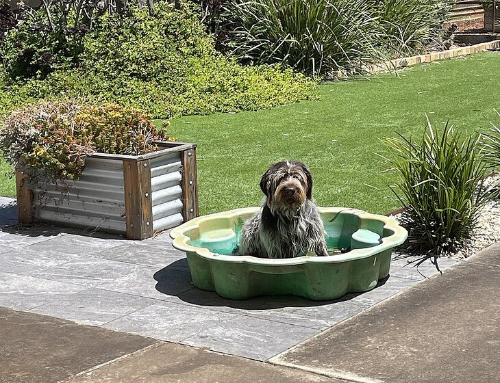 8 sheep 1 alpaca. Assorted poultry budgies. Fish pond and aquarium. large vegie garden on watering system. small amount of other watering required. Large very laid back older dog that wants to folllow everywhere.