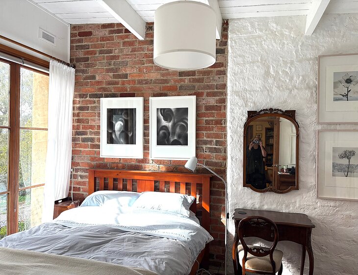 Historic mud-brick house, c. 1949, on half-acre bush block on quiet street with views over to hills. Close to transport and shops. Two bedrooms. Two bathrooms. Two fireplaces. Two standard poodles. Library. Large open-plan sitting and dining room and fully-equipped kitchen with walk-in pantry. Piano. In-house sound system and smart TV in second living room. Terrace, north-facing. Off-street parking.