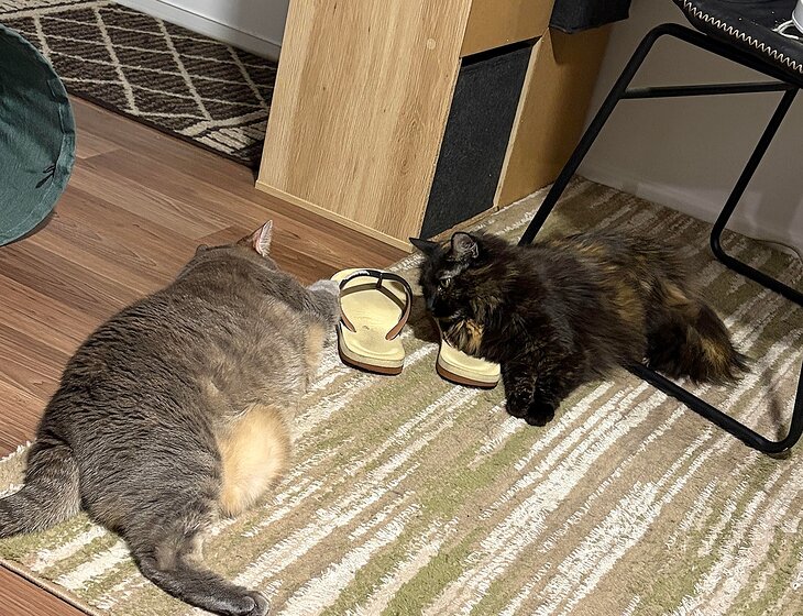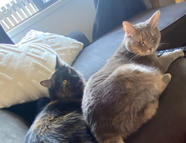 About my cats: Their names are sunset or sunny for short(tortoiseshell) and Storm(grey). They are super chill cats and don’t require too much. Sunny is a little princess and always talks and demands attention and Storm is a tomboy and likes to play rough. They are sisters and about 4 years old. As they have not had a great deal of other human interaction it will take them a bit of time to warm to you, but after that, they won’t leave you alone. They require wet food once a day along with dry food and fresh water, cleaning of their litter and daily brushing.