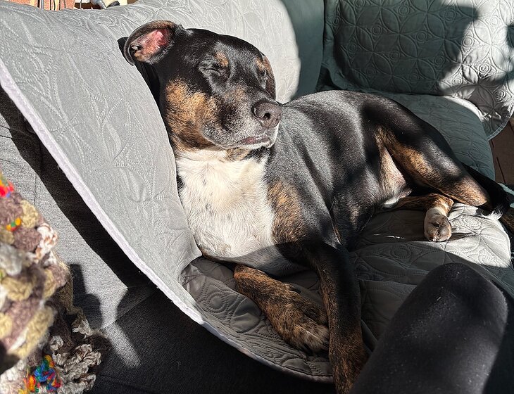 He needs someone who understands dogs and how strong he can be. He is very dog reactive, but with some simple instructions, he is easily able to still live his best life. I have been home with him for the past 6 years, so he is definitely used to company. But in saying that, he is independent too and amuses himself. He’s not fantastic with kids, but will be fine if supervised.