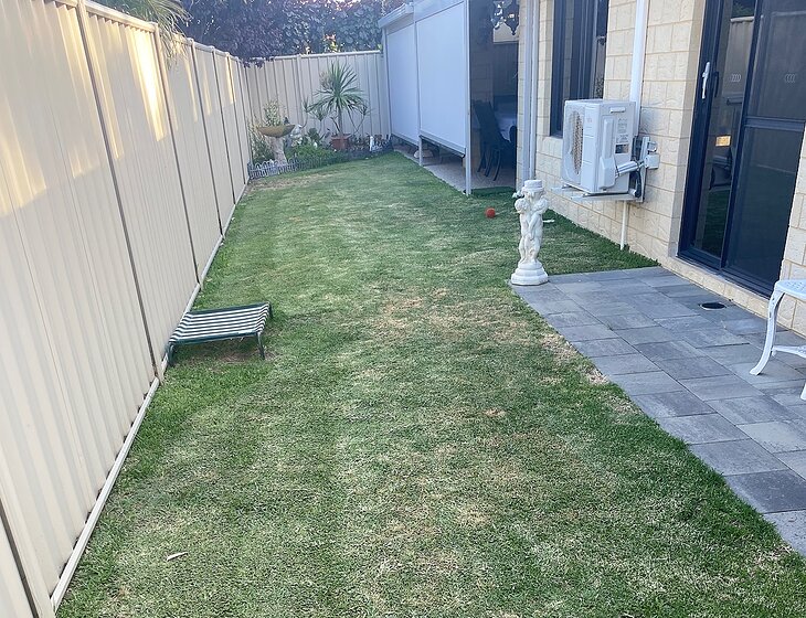 compact modern 4x2 long driveway for rv if required, a/c retic very small lawn and garden 600 meters to major shopping centre and 2 ks from train station 2 year old standard poodle enclosed dog park 1 kilometer away very private location.