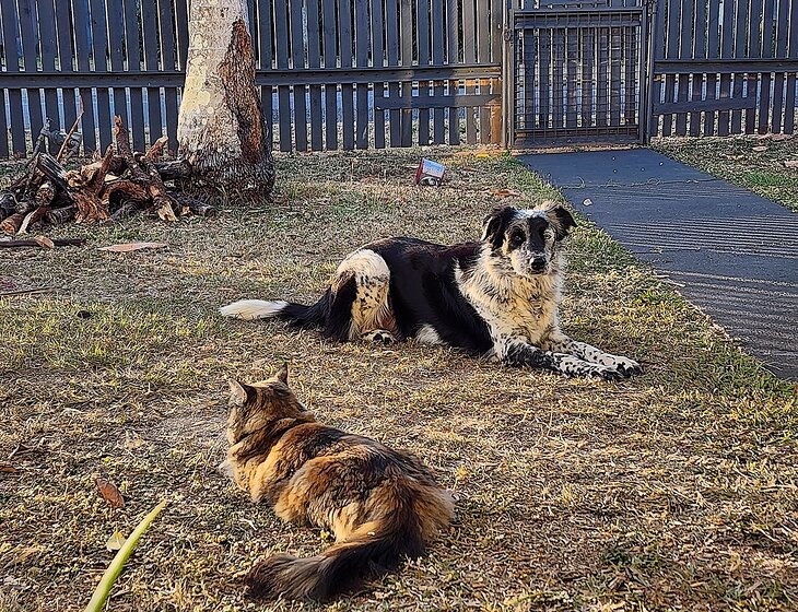 We have a cat and a dog who love attention. Our dog, Kaddi, is a border collie × blue cattle dog. She's 11 years old, but still loves a walk. Our cat, Alexa, is 5 years old. She likes to be inside and outside and is not shy about telling you when she's hungry.