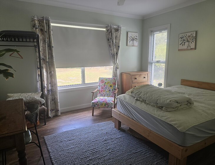 2-bedroom home on 1-acre block with 2 dogs, 6 chickens, and a couple of fish. 1.5 km to estuary & 3km to pub. Only 1 bedroom available, as dogs have the other.