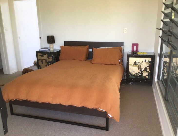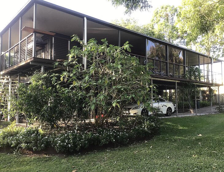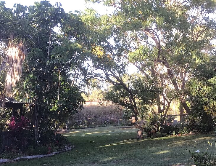 Reasonable garden, lawn, large trees and a tropical enclosed garden with pots. Some pots scattered about and on the deck. Air conditioner and overhead fans in each room. Smart TV.