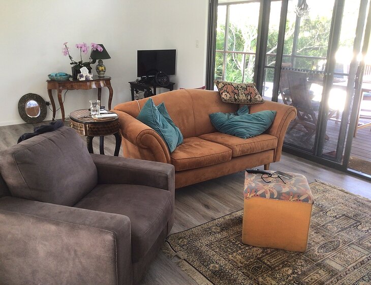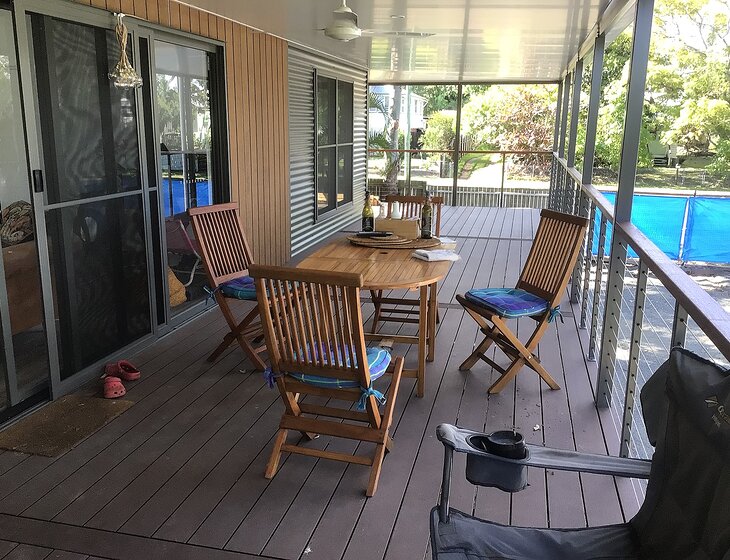 Modern high set house, 2 bedrooms, 2 bathrooms, open floor plan living. Large deck set up as dining area.