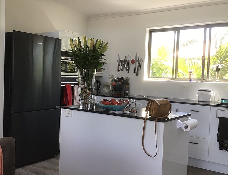 Kitchen has induction hot plate, refrigerated filter water, high end Fisher &Paykel oven.