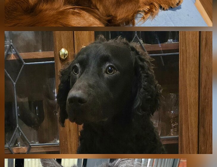 Angel King charles cavalier, River Murray river curly retriever. Jasper fluffy cat.
